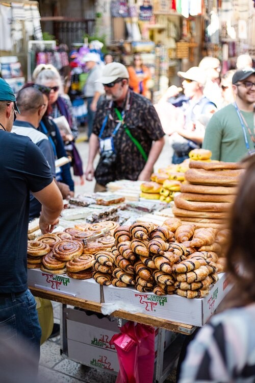 In the Old City, look for iconic ka'ak al-Quds: long, sesame-crusted oval rings, soft inside with a crisp exterior. Vendors push wooden carts piled high, calling out "Ka'ak!"—grab one for just a few shekels and dip it in za'atar or olive oil for the ultimate snack.